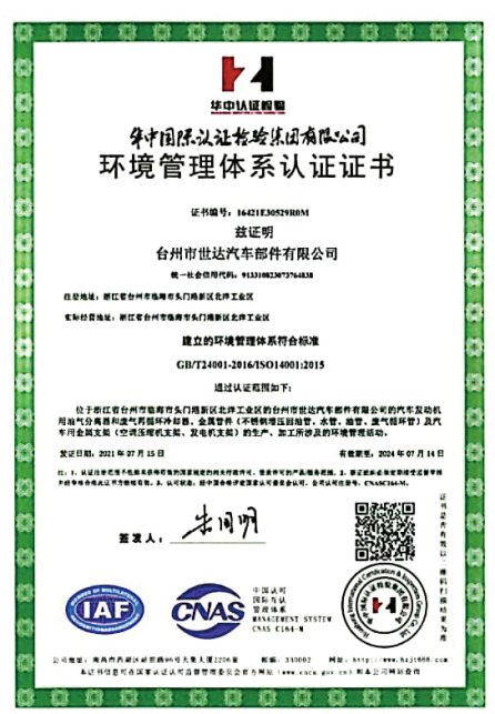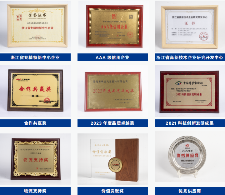 台州市世达汽车部件有限公司是浙江省成长型中小企业重点培育企业,获得了临海市五十强企业、台州市清洁生产企业、台州市高新技术企业等荣誉称号。公司重视人才培养,注重产品开发,与国内外汽车制造商和各高校长期合作,拥有一流的实验检测设备,并获得国家发明专利。在杭州浙江大学创业园成立“伟达研发中心”建立了完善的管理体系和质量保证体系,公司已通过IATF16949国际质量体系认证和ISO14001体系认证。